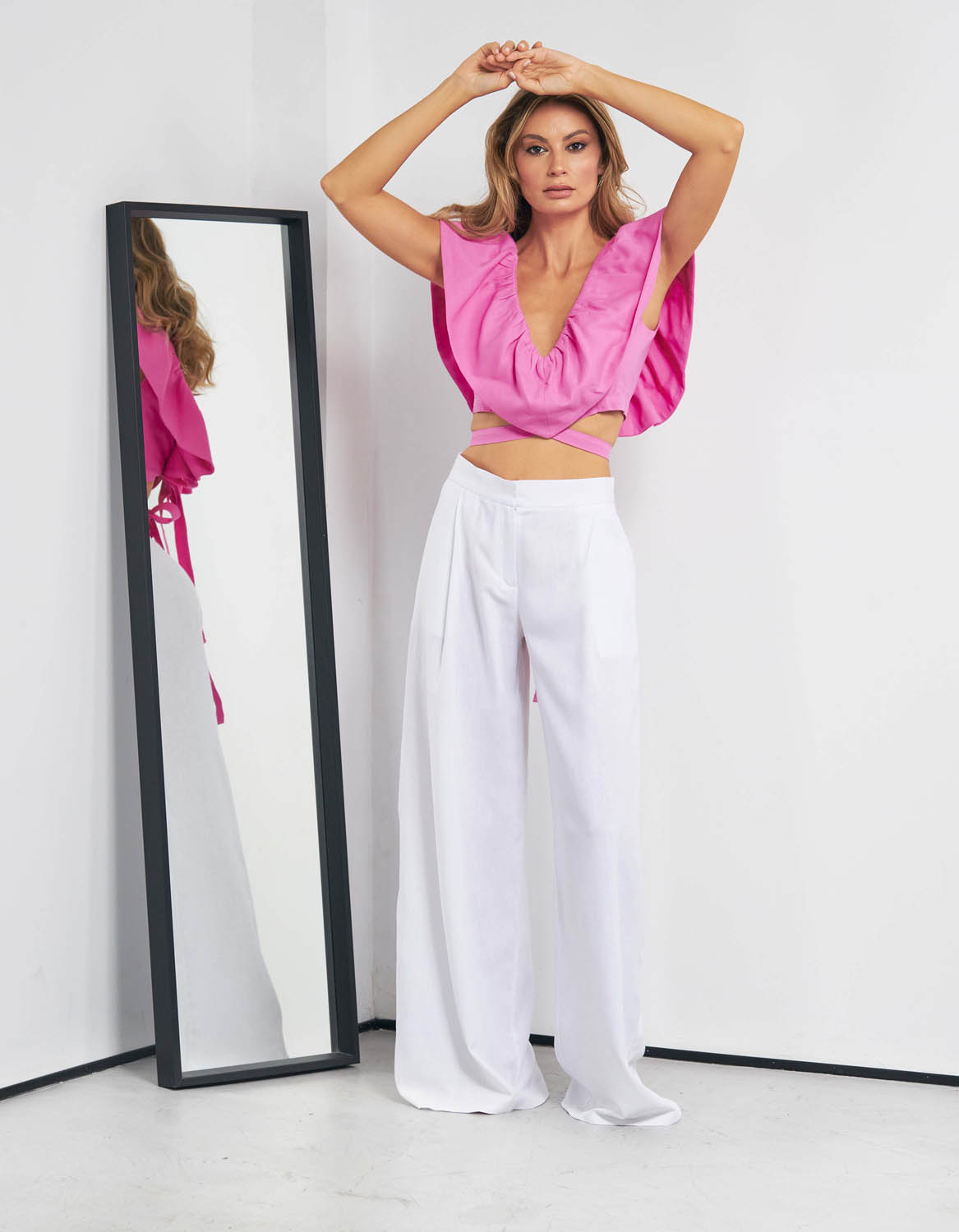 Top tip bustiera din in de calitate superioara, cu volane si inchidere reglabila cu cordon la spate. Poate fi purtat atat cu incaltaminte cu toc, cat si cu incaltaminte casual, asortat unei perechi de pantaloni largi.